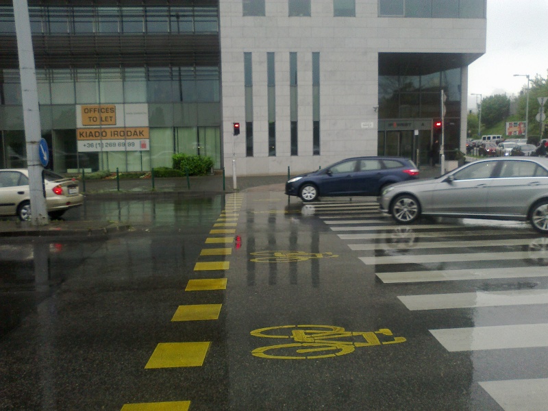 Már az út utolsó harmadánál járok, itt a járdán megyek, számos okból. Az egyik, hogy az út jobb oldalán végig autók parkolnak, így ott közlekedni nem egy életbiztosítás: bármikor a biciklis képébe nyílhat egy jármű ajtaja. Ha meg kellő távot hagyva próbálkozik valaki, feltartja a forgalmat és hallgathatja a dühös autósok dudálását. Sokszor láttam ilyet – bármennyire gyorsan is tekert az illető, azért az autók gyorsabbak voltak, s végül visszakényszerítették a parkoló járművek ajtónyitási zónájába.